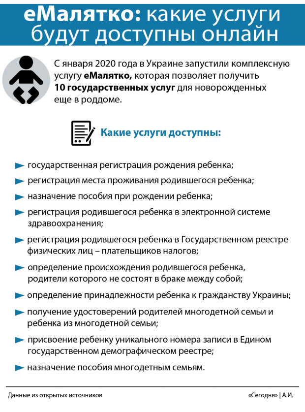 Зовсім недавно в Україні запустили комплексну послугу, яка допоможе молодим батькам не подавати десятки документів і не чекати нескінченних папірців. еМалятко — це можливість отримати від держави 10 послуг, пов'язаних з народженням дитини, по одному електронній заяві відразу в пологовому будинку.